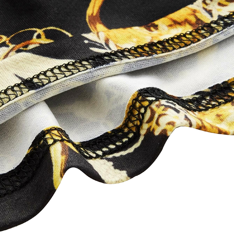 Style: VacationColor: BlackPattern Type: All Over PrintNeckline: PoloLength: RegularDetails: Tape, Button FrontSleeve Length: Short SleeveSeason: SummerComposition: 3% Spandex, 97% PolyesterMaterial: PolyesterFabric: Slight Stretch